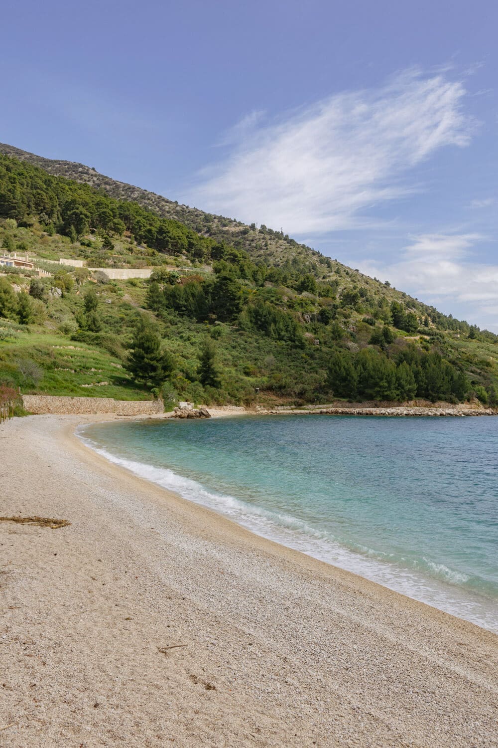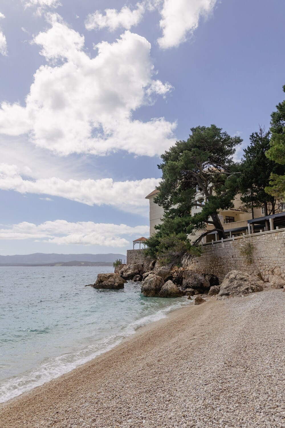 The beach is home to crystal-clear, shallow waters and perfect white pebbles, so it’s ideal for families with kids or anyone who enjoys a gentle, easy entrance into the sea. There’s natural shade from the surrounding trees, and the beach is well-equipped with amenities. You can rent sun loungers and umbrellas, and enjoy a meal or drink at Ribarska Kućica, a charming restaurant and bar housed in a traditional stone building. It’s the perfect spot to try some traditional Dalmatian cuisine while enjoying the beach!